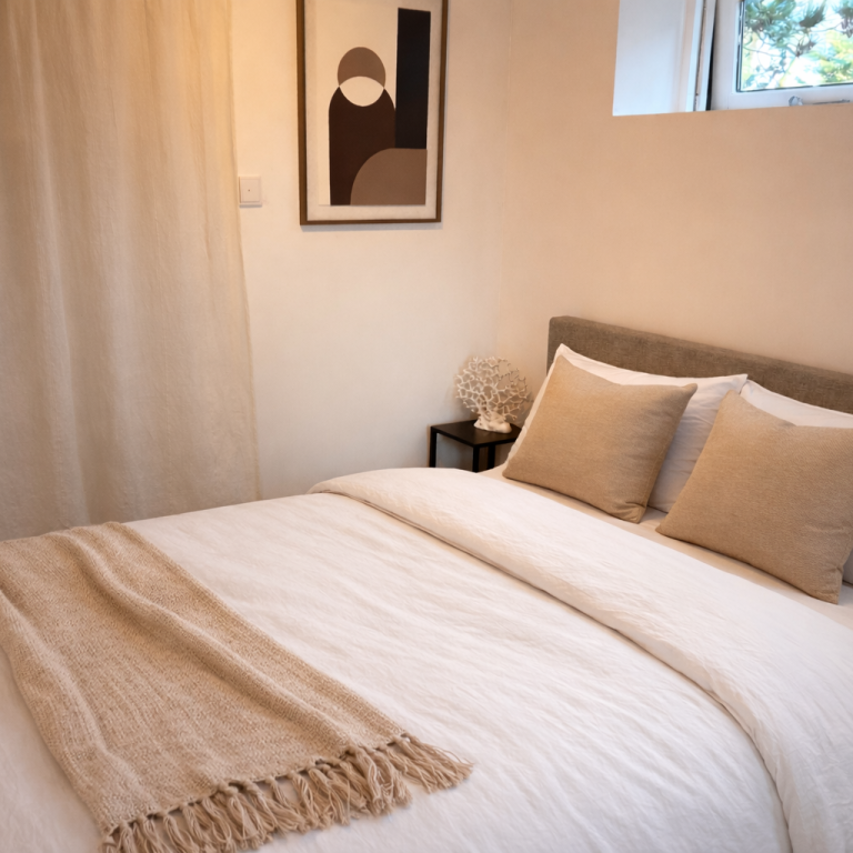 Das Haus ist modern, stilvoll und komplett ausgestattet für einen angenehmen Aufenthalt. Santos verfügt über zwei Schlafzimmer, ein helles und gemütliches Wohnzimmer, eine moderne, voll ausgestattete Küche und ein Badezimmer. Zusätzlich gibt es zwei WCs.